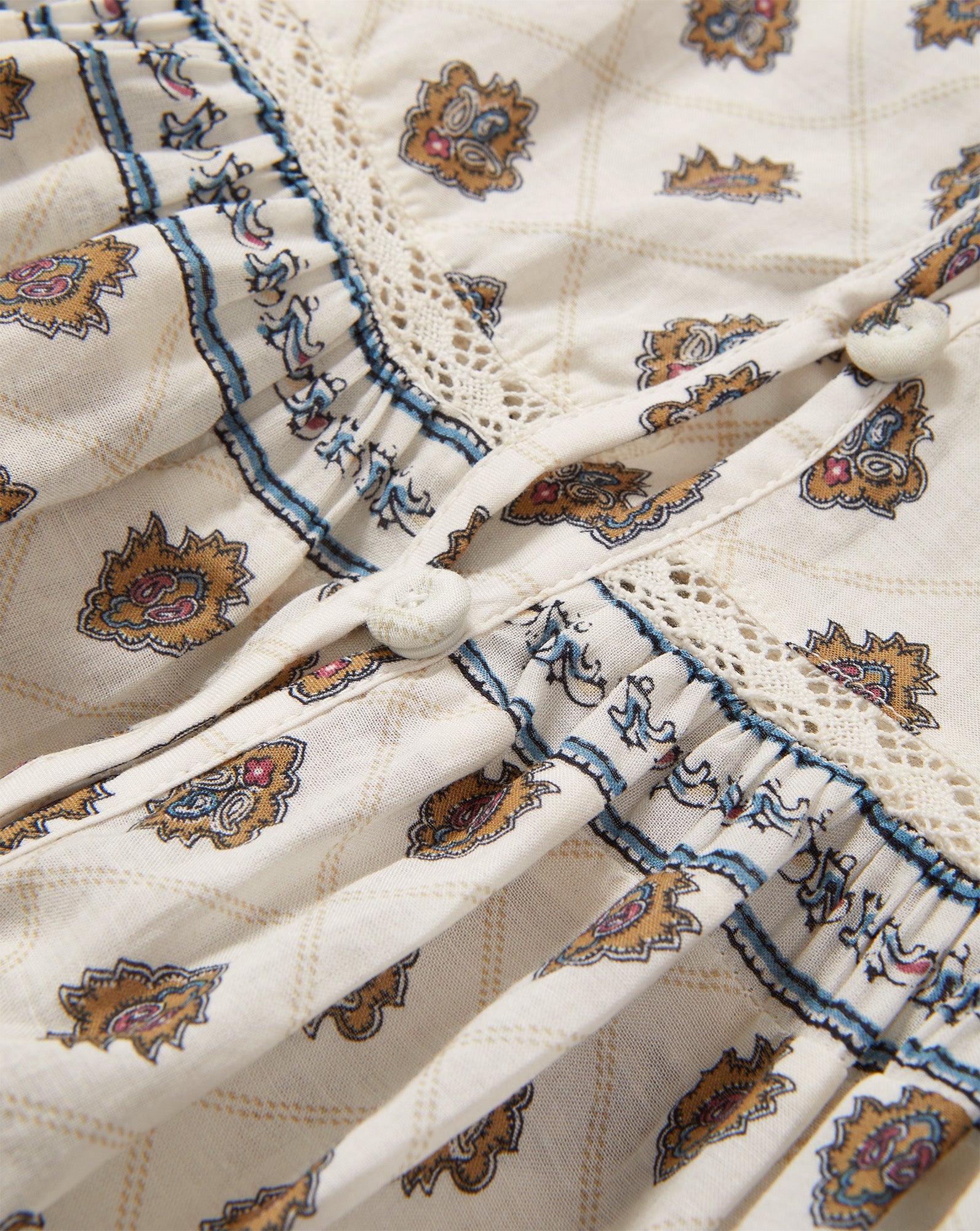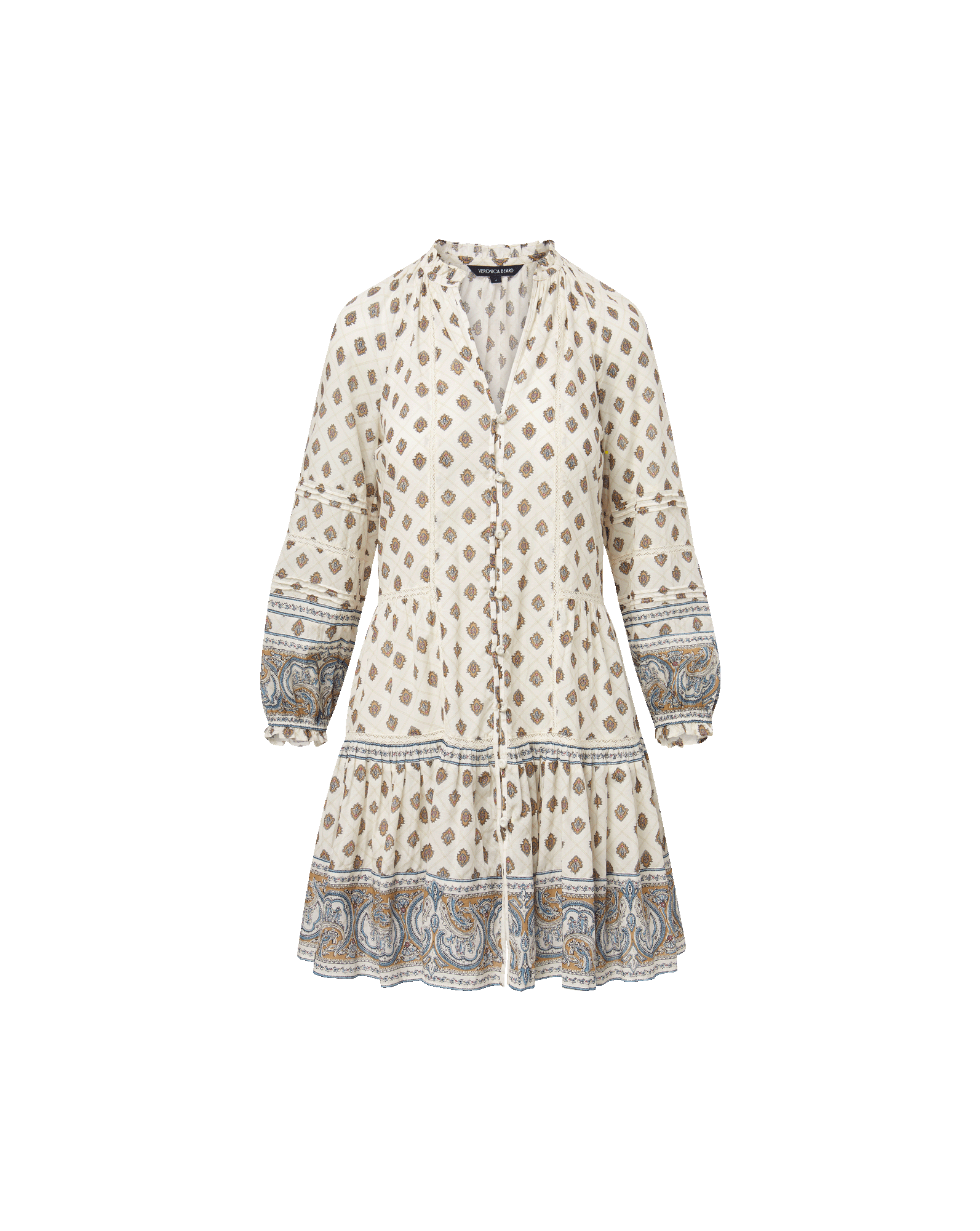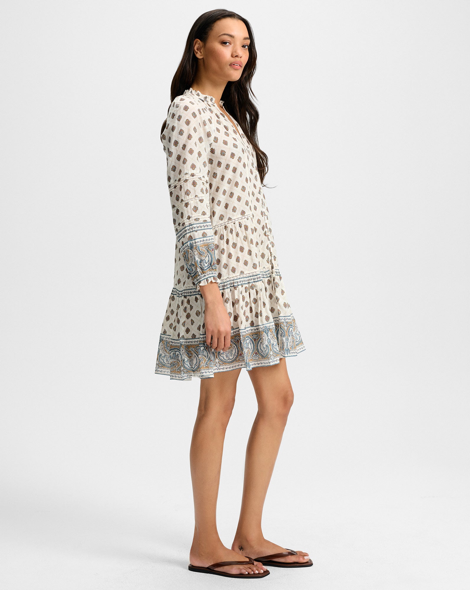 Bohemian ease. Crafted from premium stretch cotton. the Belissa mini dress features a breezy tent silhouette with blouson sleeves and a charming flounce at the bottom. Tight ruffles at the v-neck neckline and cuffs add romance while an engineered print mixes pretty paisleys and a geometric tile pattern. Perfect for weekend and wanderlust—just add sandals and go.
