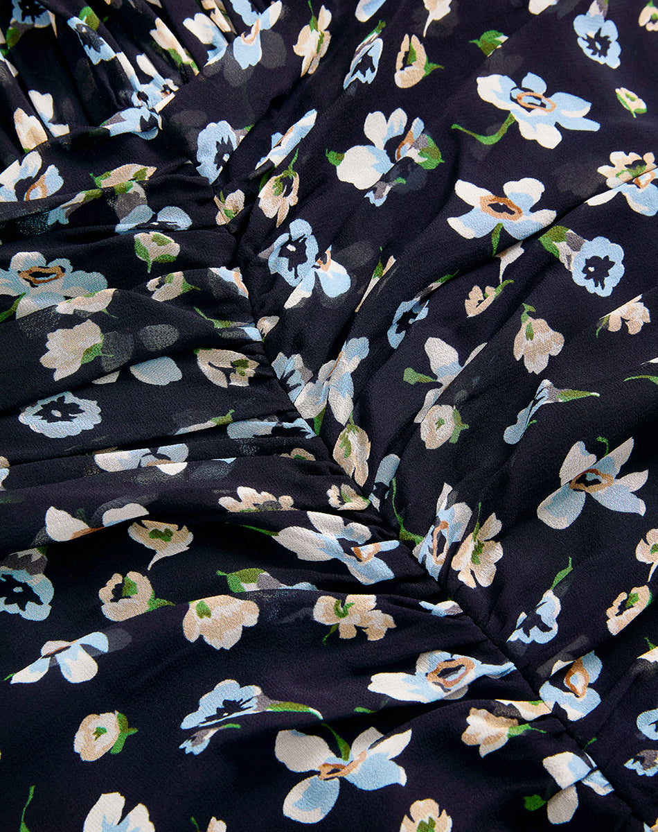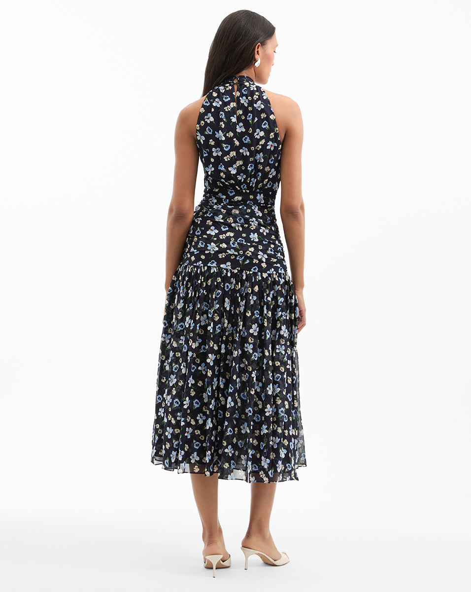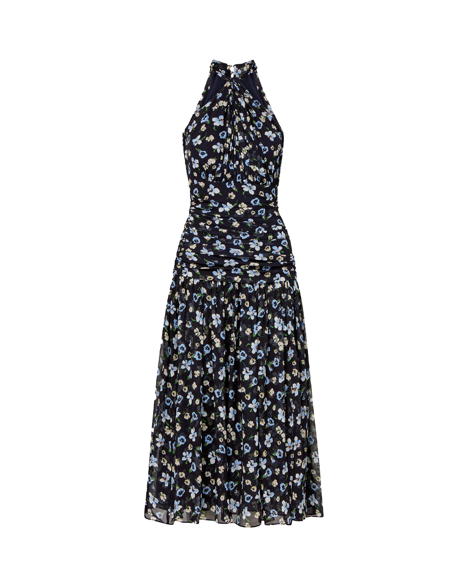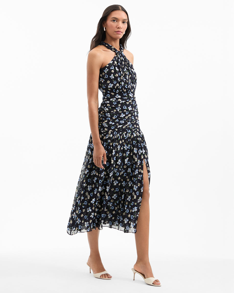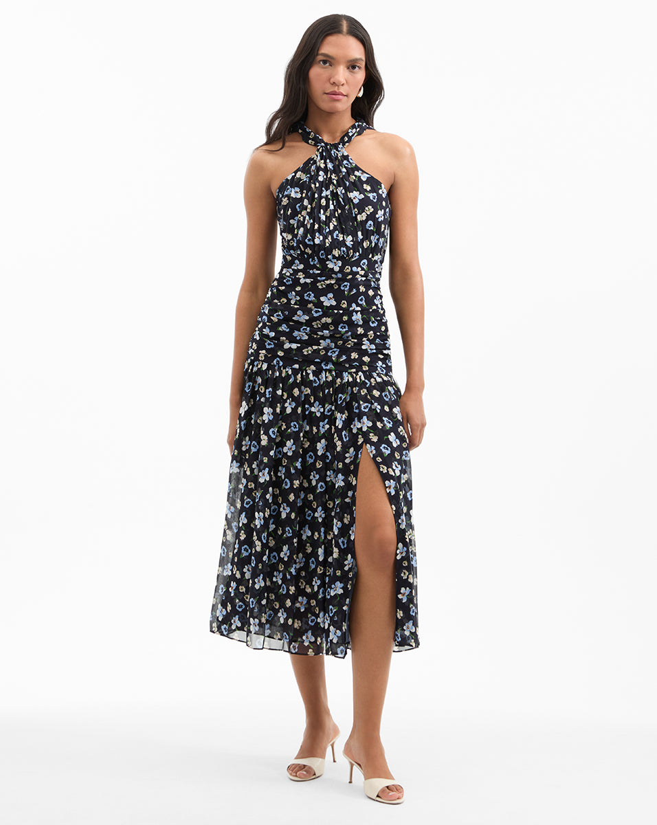 An iconic dress for all your spring events. Crafted from 100% silk. the Brock features an allover floral print and a flattering. slim fit. The ruched drop waist accentuates the waistline before flowing into a fluttery midi skirt with a side slit for ease. A crisscross halter neckline and back keyhole with a double-button closure complete the look. Style with dainty heel and a rattan clutch for your next spring wedding or garden cocktail.