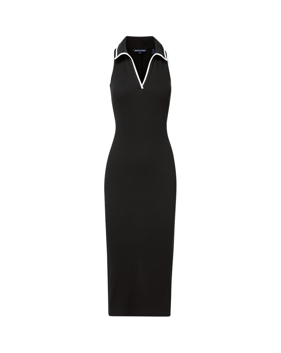 Effortlessly chic and sporty. this body-skimming polo dress is knitted from premium stretch cotton for a perfect fit. The sleeveless. midi silhouette. in black. features white contrast piping along the armholes. collar. and neckline. Pair this versatile go-to with sandals for a laid-back look or dress it up with heels for something more polished.