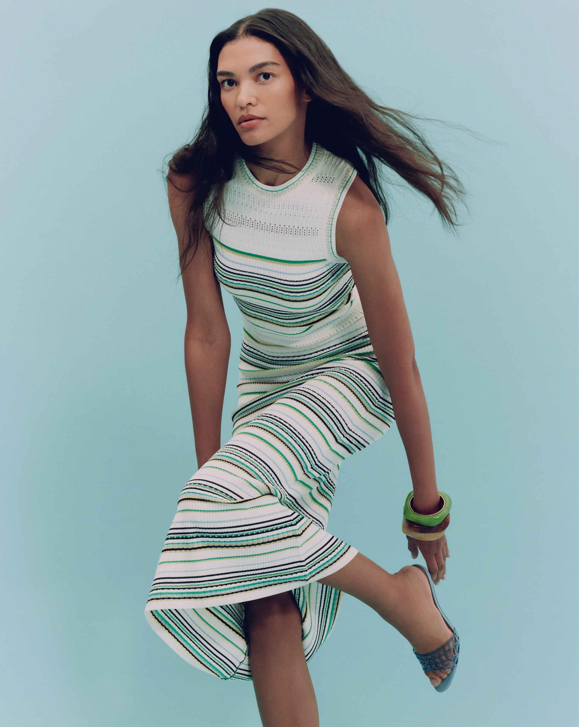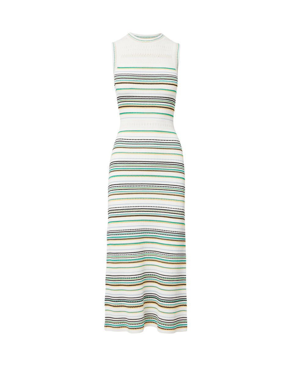 Effortless elegance. The Dawna maxi dress combines a sleek body-skimming silhouette with the comfort and flexibility of our super-stretch. ribbed knit blend. The multicolor stripes in white and greens. meanwhile. add visual intrigue. Consider this sleeveless style the perfect day-to-night. one-and-done wonder—chic with both sandals and elegant stilettos.