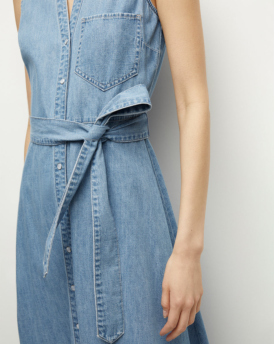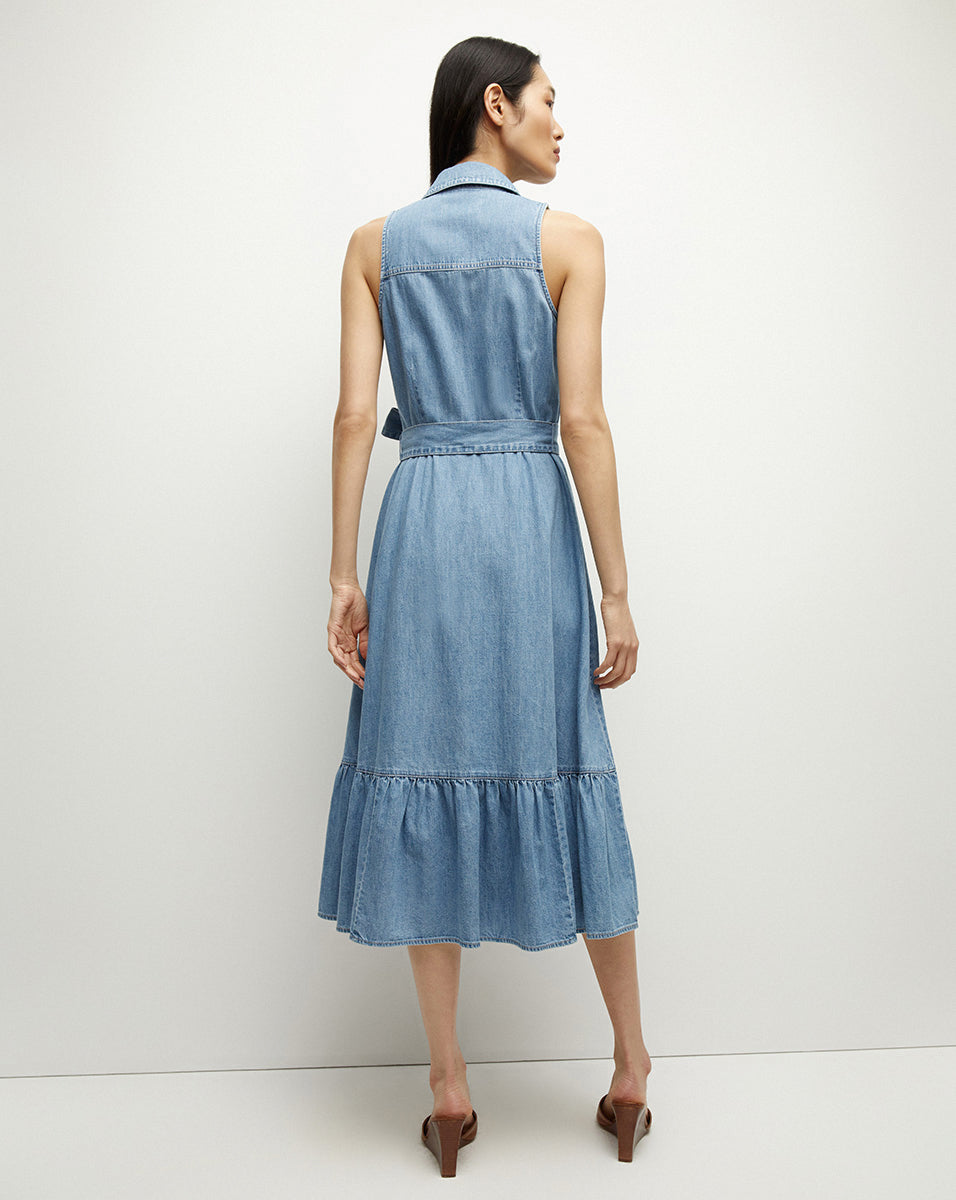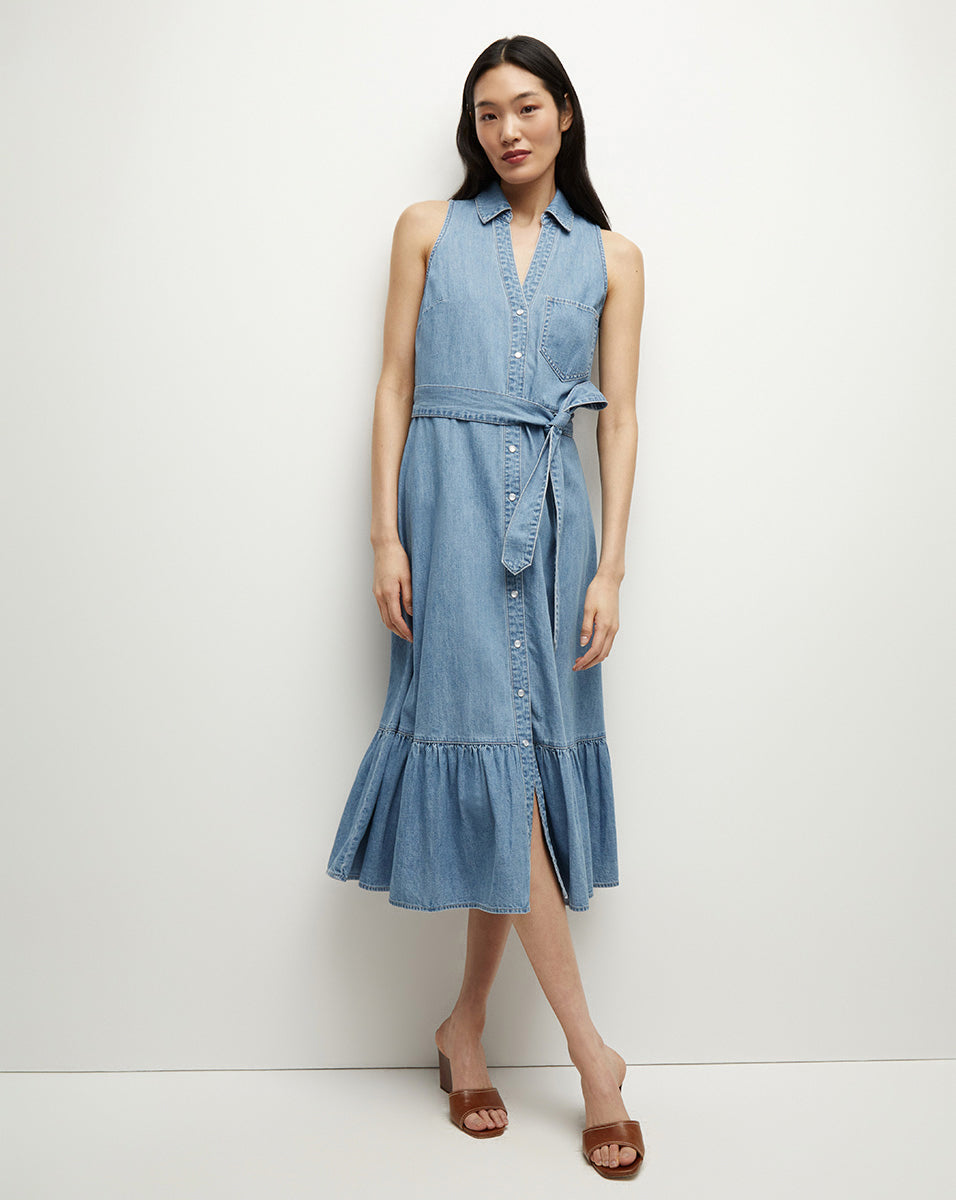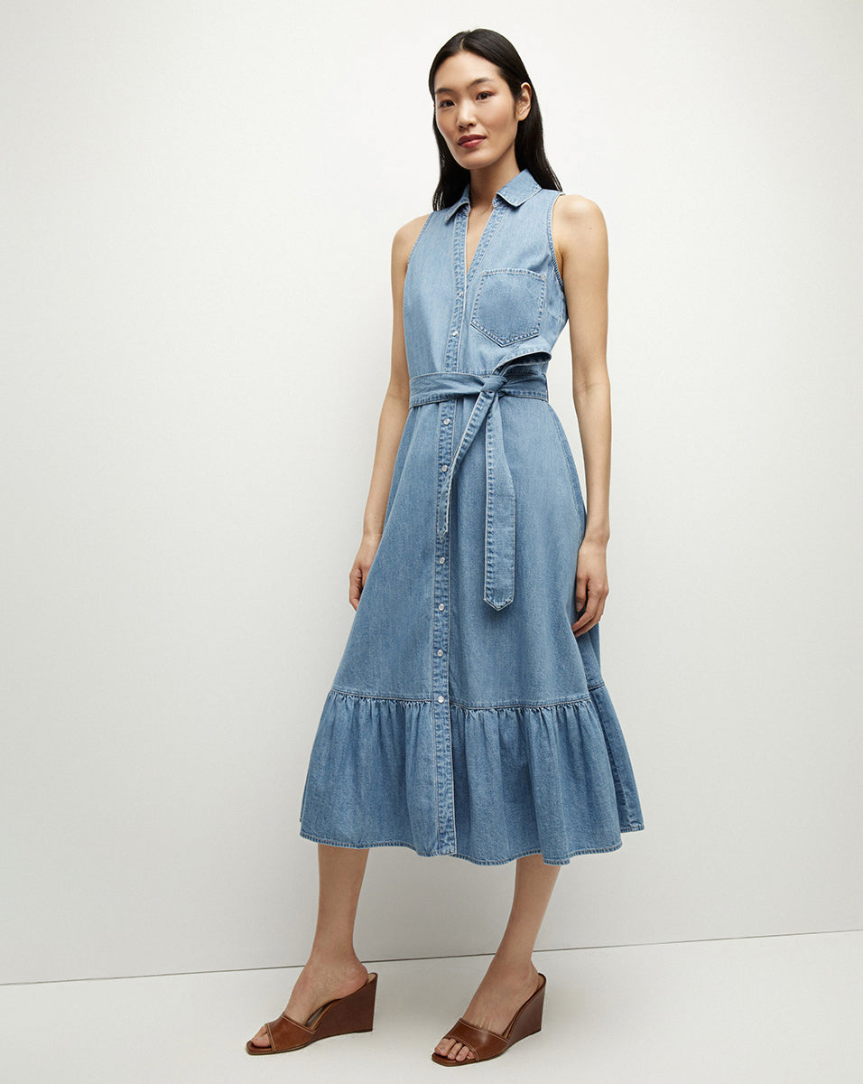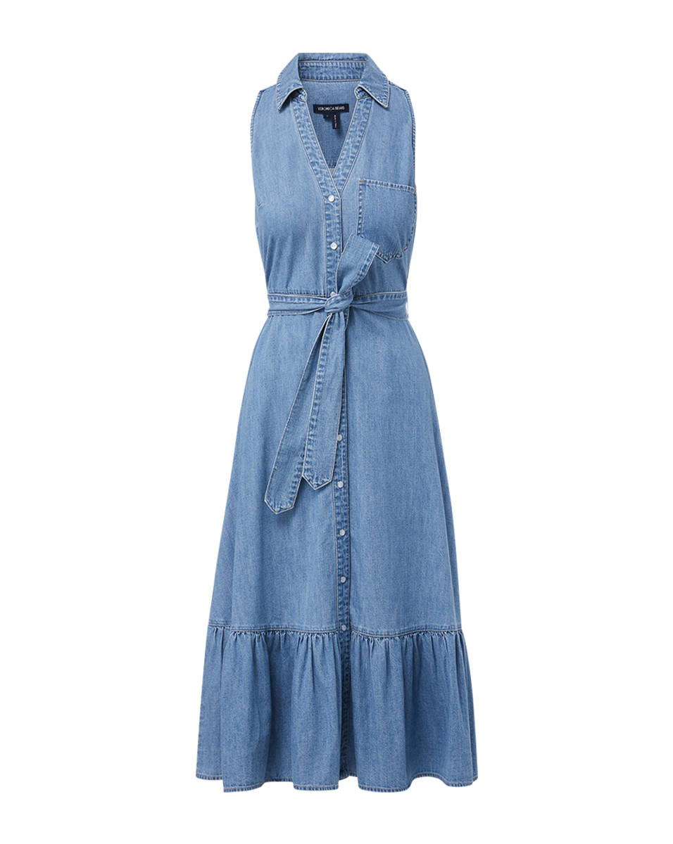 Made from 100% cotton denim. this lightweight shirtdress features a neat collar and a feminine flounced hem. Finished with a patch pocket and a waist-defining tie belt. it pairs well with sandals in the summer and boots as the weather cools down.