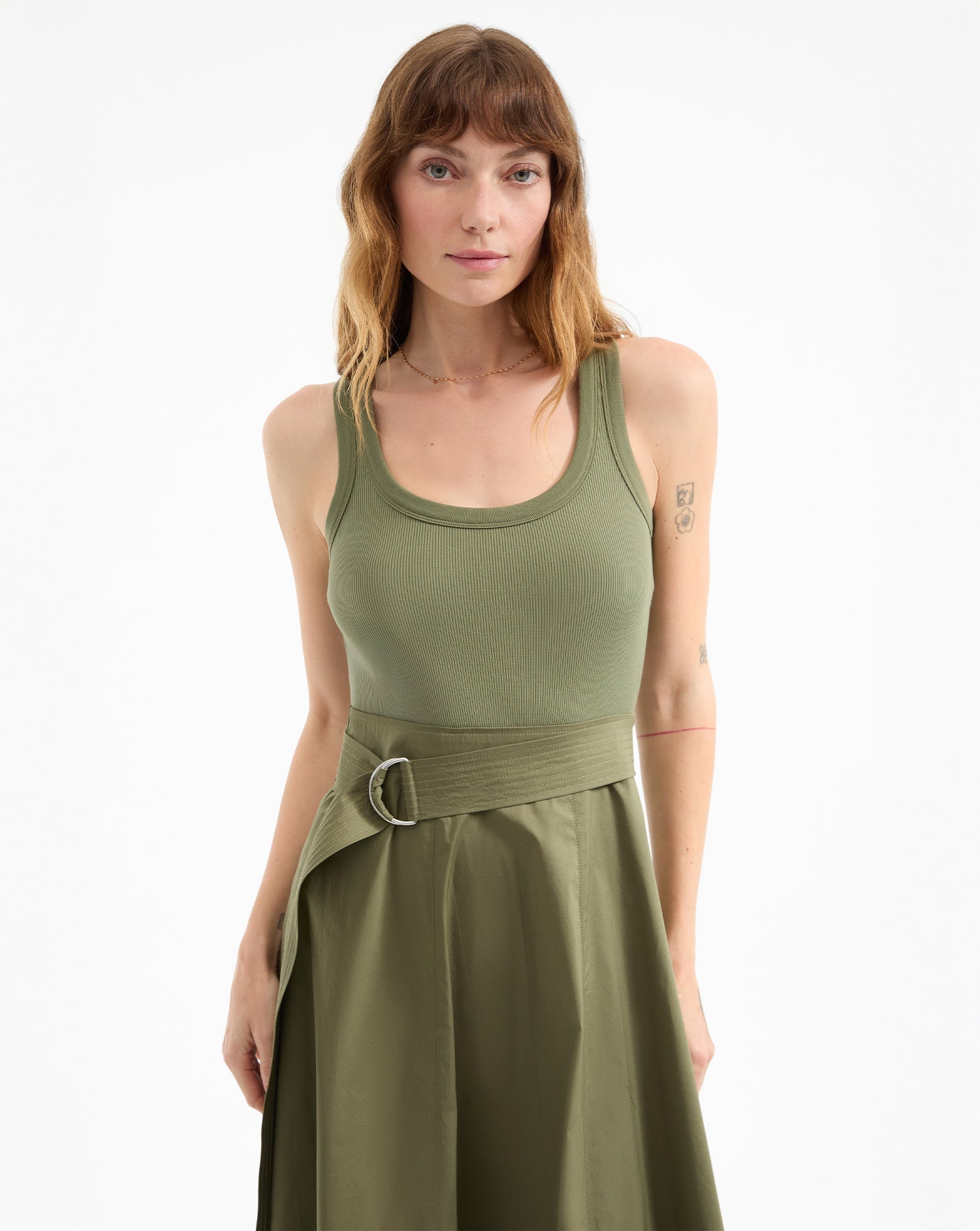 The top: a soft cotton tank. The bottom: a crisp A-line skirt. with a D-ring belt. The latest addition to our mixed-media lineup. the Ennis midi dress in army green. is a one-and-done wardrobe hero that takes the guesswork out of getting dressed. Complete the laidback look with strappy sandals or pair with platforms and a scarf for getaway chic.
