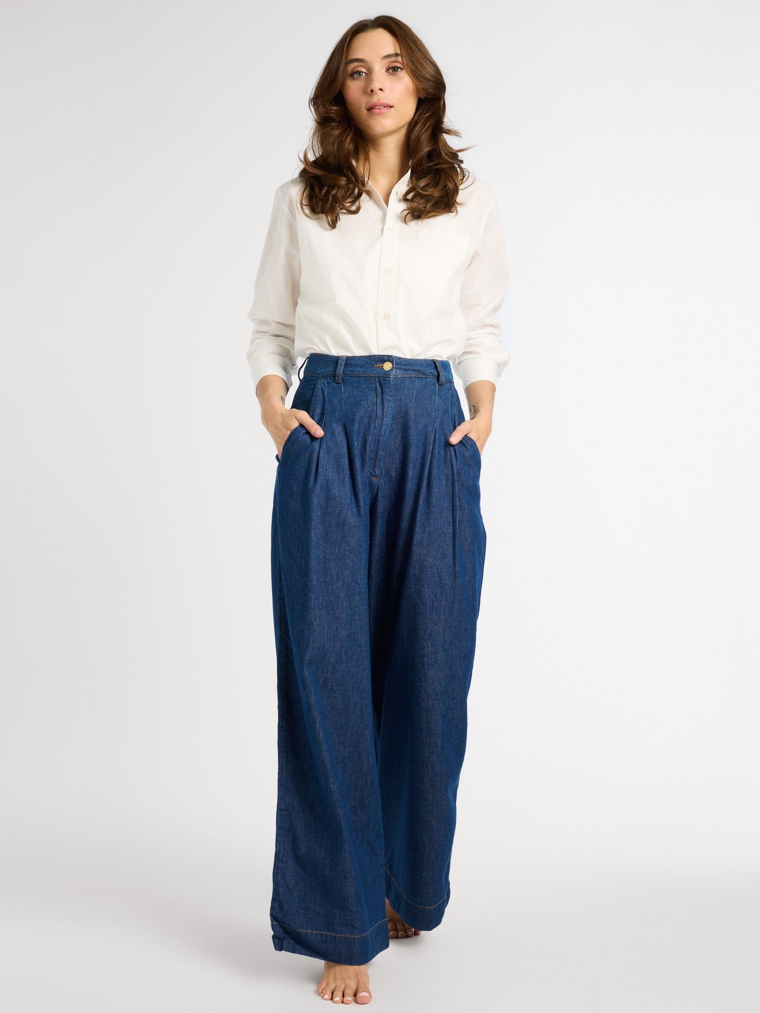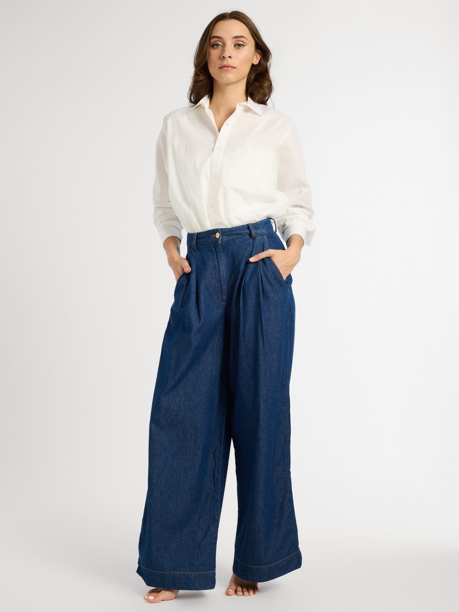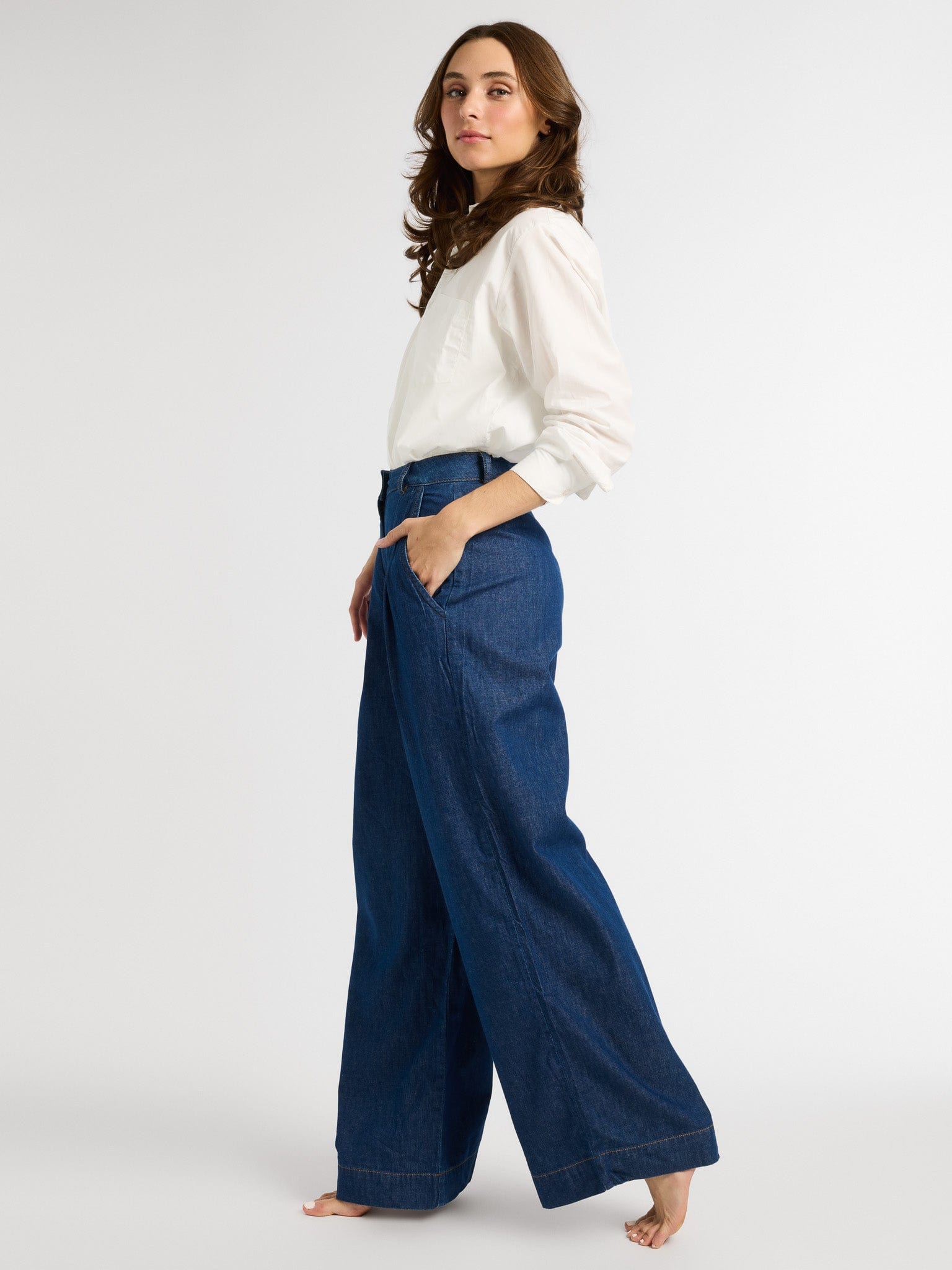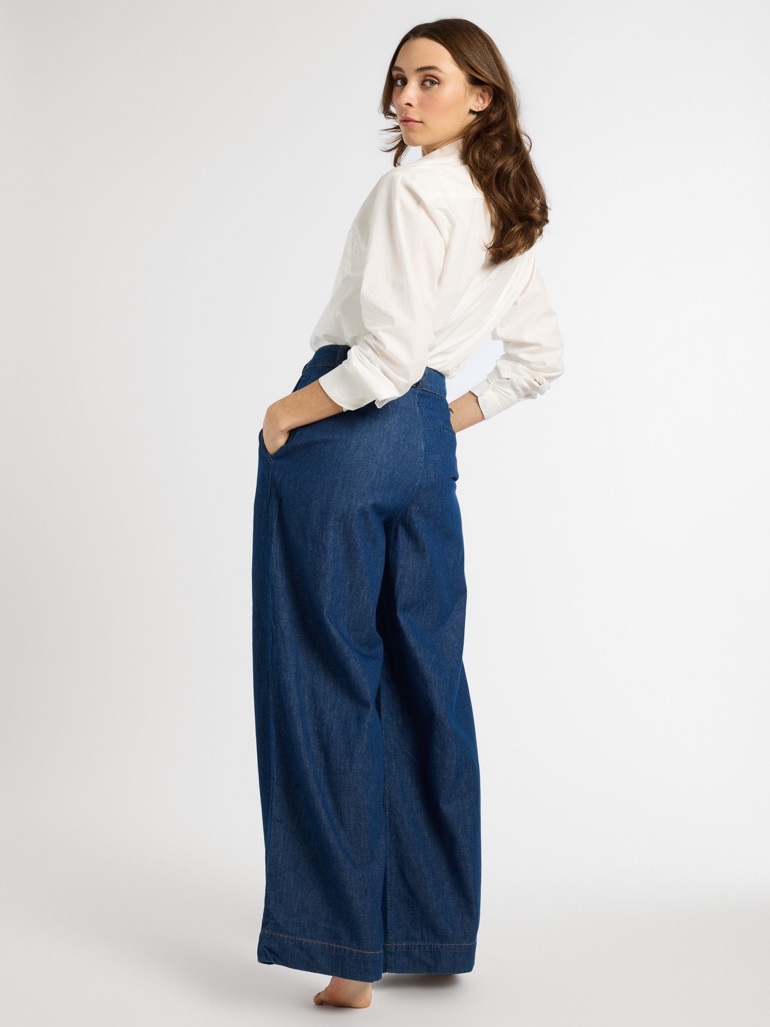 Our wide leg. denim Hepburn pant features a pleated waist and full trouser leg. A silhouette made famous by style icon Katharine Hepburn. Front slash pockets. high rise button waist with zipper fly.