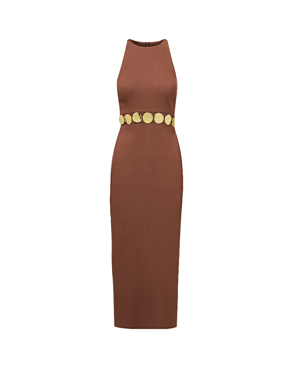 A sheath dress. with a glamorous upgrade. Expertly tailored from Italian stretch linen. the brown Isla midi is a timeless closet hero. The streamlined silhouette. with a chic closed-back halter. boasts hammered gold medallions and peekaboo cutouts at the waistline for trompe l'oeil belt effect. Wear solo or layered under a blazer—or both ways for a stylish day-to-night quick-change.