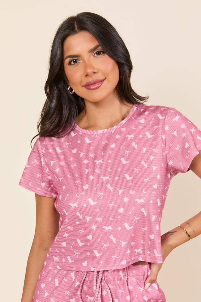 Lainey Waffle Knit Pink Western Icon Pajama Top