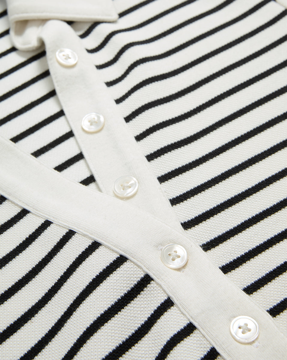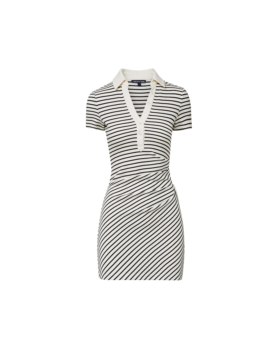The perfect polo dress in black and white stripes. The ultimate in one-and-done ease. the Lanier mini dress has just the right amount of stretch to hug the body beautifully. Designed for versatility. this wardrobe essential can pair with sneakers. sandals. and heels alike. making it a must-have for both getaways and every day.