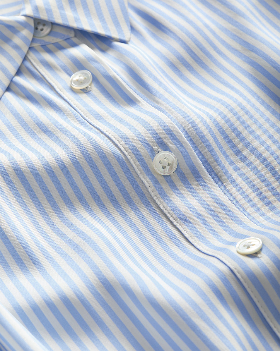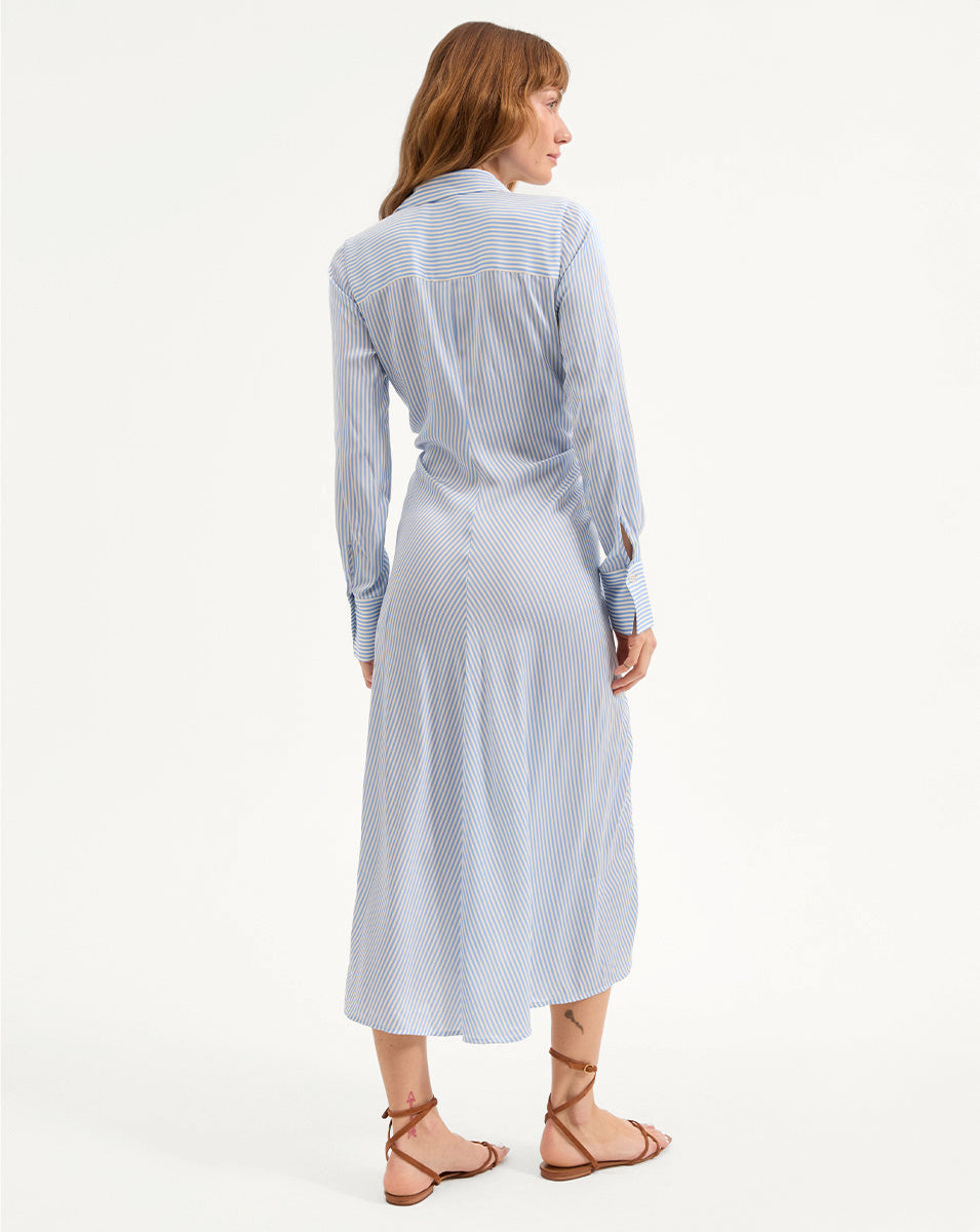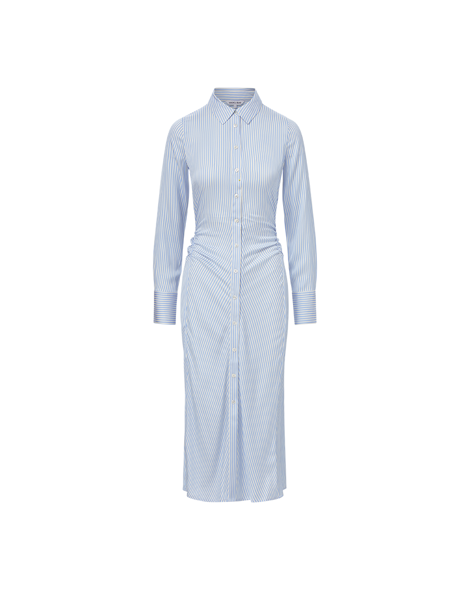 The shirtdress. reimagined. Expertly tailored from premium stretch silk. the Lex dress is an elegant take on the wardrobe classic. The midi style. in blue and white stripes. features ruching on the sides for waist definition and a beautiful drape. Dress it up or down. wear it day or night. with flats or heels. Pro tip: Leave a few buttons undone at the bottom for a sexy front-slit effect.