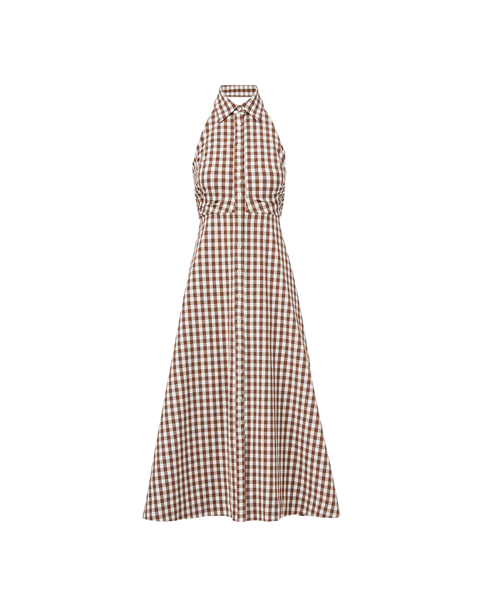 The perfect summer dress. in brown-and white gingham. Expertly tailored from premium cotton seersucker—with stretch for ease—the Mackey shirtdress features a chic halter silhouette. an open back. and a long A-line midi skirt while gathering at the waist cinches the silhouette. Pair with flats for weekend ease or dress up with heels and jewelry for garden party.
