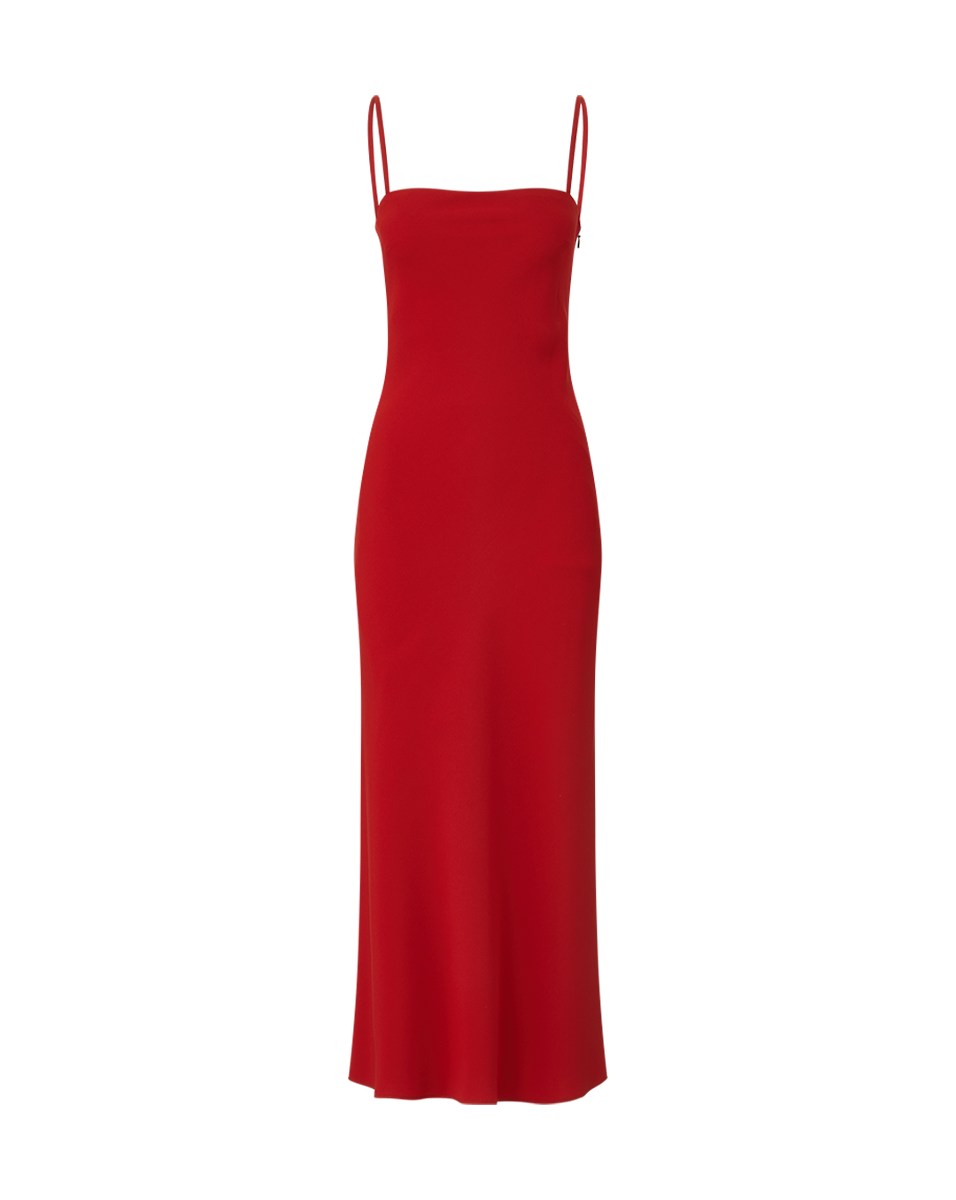 The Mavis is a versatile maxi slip dress featuring a square neckline and a body-skimming fit. All clean lines and a sleek. streamlined silhouette. this crimson red dress is perfect for date night or cocktail hour.