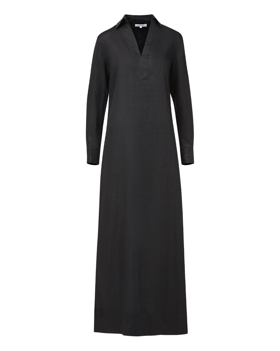 Our cool take on the classic caftan. Expertly tailored from lightweight and breathable linen. the Moore maxi dress is effortless. minimal. and endlessly versatile. A collared deep V-neck adds subtle structure while high side slits and a pleated back yoke ensure ease of movement. With its understated elegance and one-and-done appeal. it's the perfect summer go-to for getaways and everyday. Pair with gladiator sandals—and. to dress it up. add jewelry and gold chain-link belt.