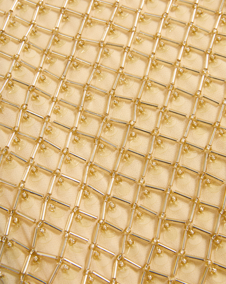 The evening dress. perfected. The Petra maxi dress is equal parts ease and elegance. Featuring a clean. streamlined column silhouette. the chiffon body is hand-beaded in India with a mix of glass bugle beads and paillettes in an intricate netted pattern. evoking coastal textures. Finished with adjustable straps. a square neckline. and a hidden side zipper. it's the perfect choice for your upcoming summer soirées—just add a simple heeled sandal.